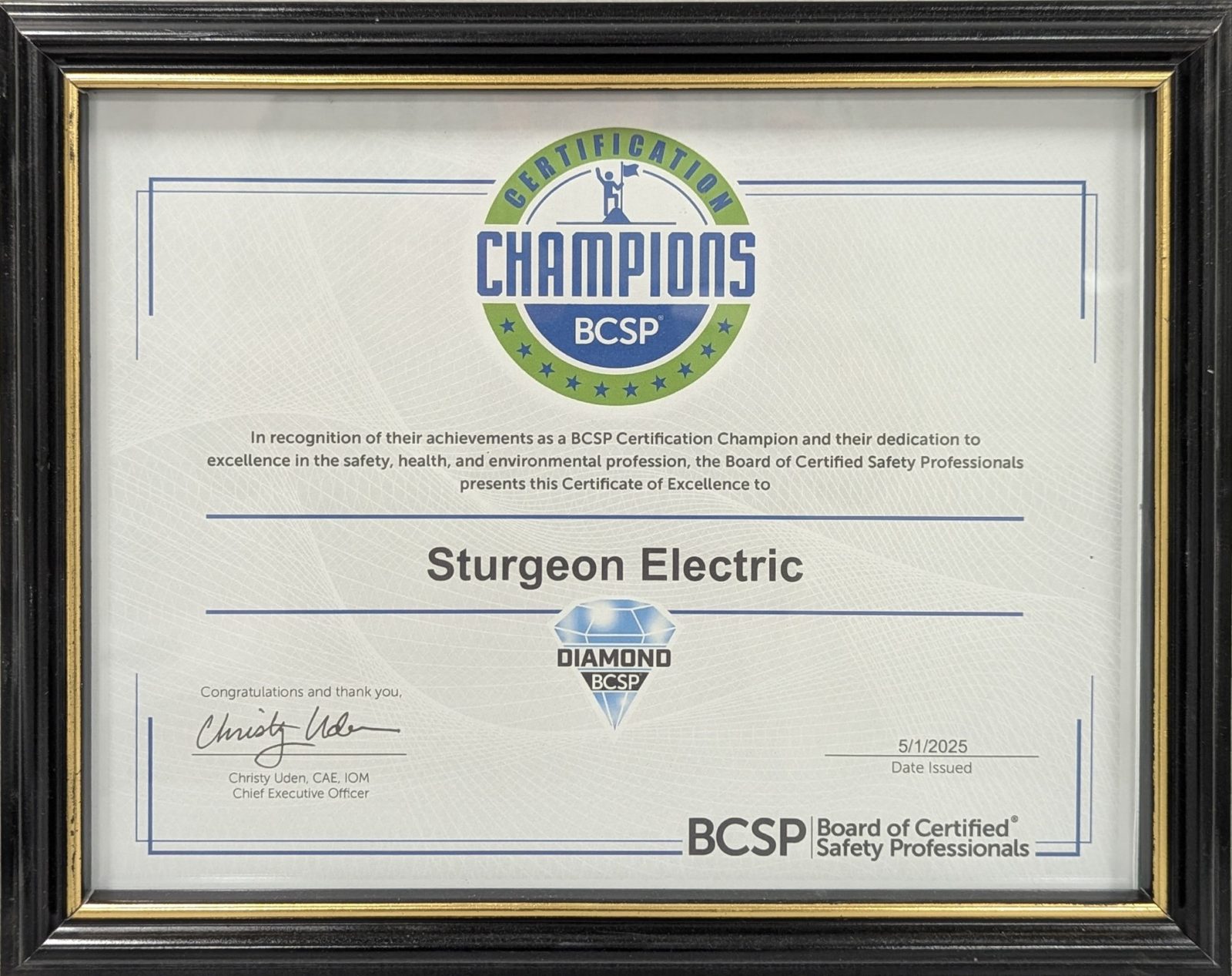 Boasting more than 100 BCSP-certified employees, Sturgeon Electric attained Diamond status with BCSP again in May 2025. The ranks of certified individuals include foreman and general foreman who provide field supervision, as well as safety personnel.